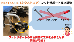 NEXT CORE(ネクストコア)の場合は、オレンジの○の部分を操作するだけで工具を必要とせずにフットサポートの高さ調整が可能となります。
