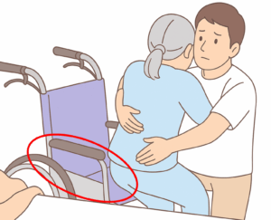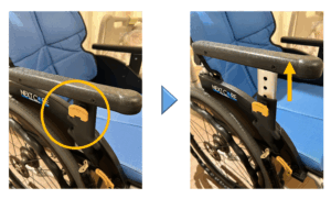 赤丸の部分のアームサポートフレームがベッドから車椅子に移乗する際、接触してしまう可能性があるため、下記の図のようにアームサポートフレームが跳ね上げることで移乗の際の導線が確保しやすくなります。