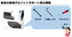 多くの車椅子はフットサポートの高さを調整するために、スパナや六角レンチなどの工具を必要とします。