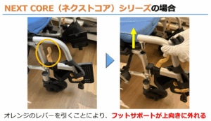 NEXT CORE(ネクストコア)の場合は、オレンジの○の部分を操作するだけで工具を必要とせずにフットサポートの高さ調整が可能となります。