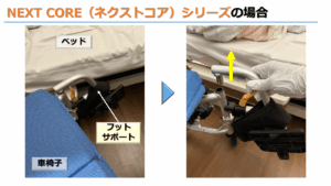 NEXT CORE(ネクストコア)の場合は、フットサポートが上向きに外れることで移乗をする際に再度、車椅子をベッドから離す必要がありません。