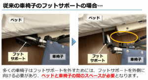 つまり、従来の車椅子の場合は、車椅子をベッドに寄せた際にフットサポートを外すために、再度、車椅子をベッドから離す必要があります。