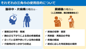 - 脳卒中の方と肩手術後の方の三角巾をつける目的