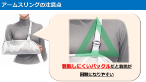 アームスリングの中には、着脱しにくいバックルがあるため、装着しやすいバックルを選ぶようにしましょう。